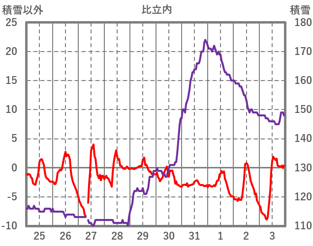 | 日 | 時 | 気温 | 降水 | 風向/風速 | 日照 | 積雪 | 降雪 |