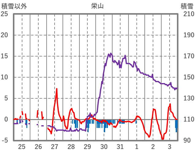 | 日 | 時 | 気温 | 降水 | 風向/風速 | 日照 | 積雪 | 降雪 |