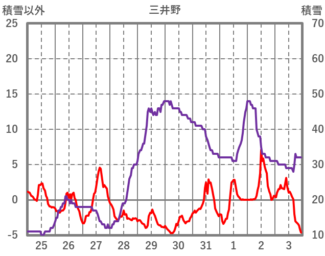 | 日 | 時 | 気温 | 降水 | 風向/風速 | 日照 | 積雪 | 降雪 |