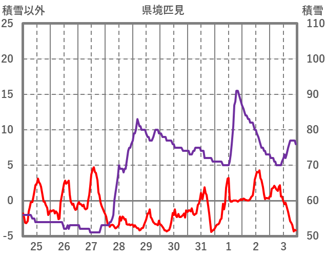 | 日 | 時 | 気温 | 降水 | 風向/風速 | 日照 | 積雪 | 降雪 |