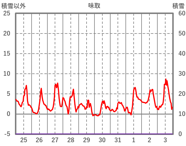 | 日 | 時 | 気温 | 降水 | 風向/風速 | 日照 | 積雪 | 降雪 |