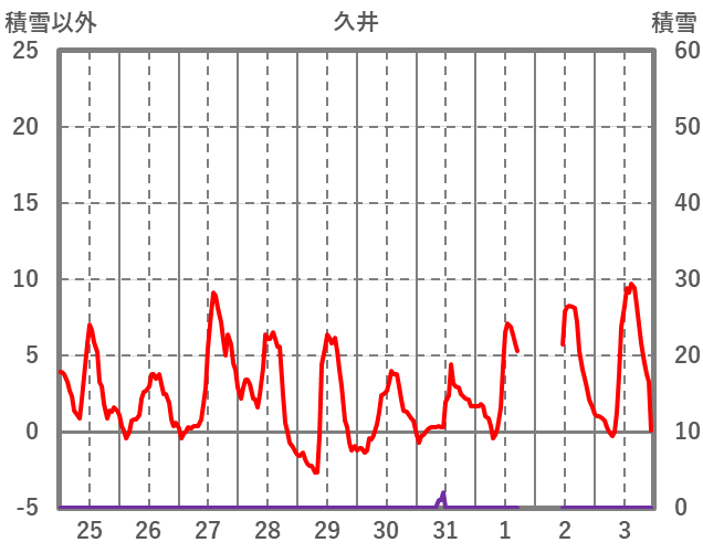 | 日 | 時 | 気温 | 降水 | 風向/風速 | 日照 | 積雪 | 降雪 |
