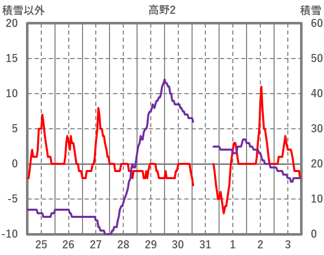 | 日 | 時 | 気温 | 降水 | 風向/風速 | 日照 | 積雪 | 降雪 |
