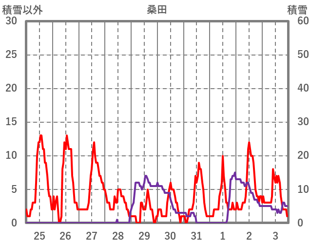 | 日 | 時 | 気温 | 降水 | 風向/風速 | 日照 | 積雪 | 降雪 |