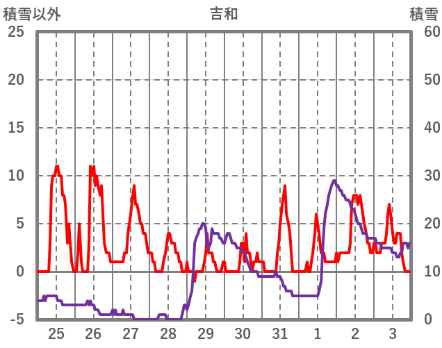 | 日 | 時 | 気温 | 降水 | 風向/風速 | 日照 | 積雪 | 降雪 |