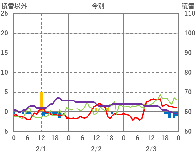 | 日 | 時 | 気温 | 降水 | 風向/風速 | 日照 | 積雪 | 降雪 |