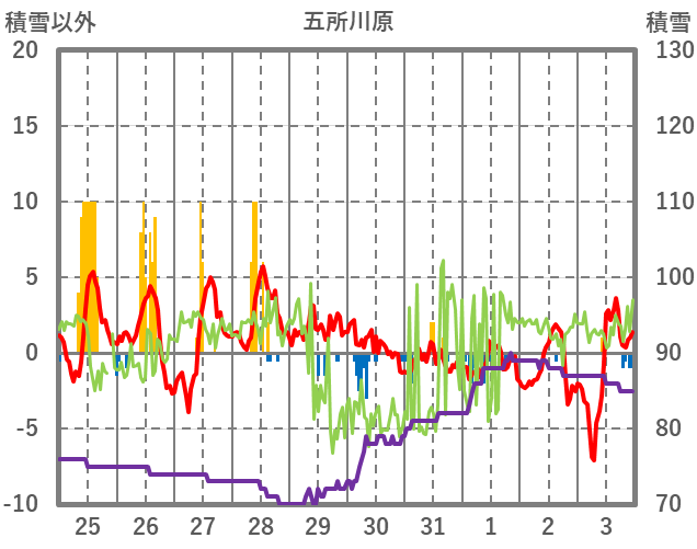 | 日 | 時 | 気温 | 降水 | 風向/風速 | 日照 | 積雪 | 降雪 |