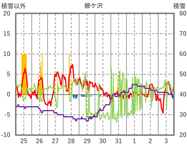 | 日 | 時 | 気温 | 降水 | 風向/風速 | 日照 | 積雪 | 降雪 |