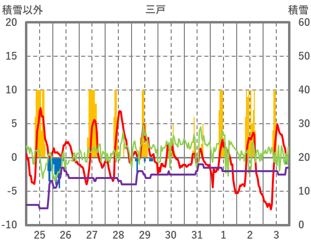 | 日 | 時 | 気温 | 降水 | 風向/風速 | 日照 | 積雪 | 降雪 |
