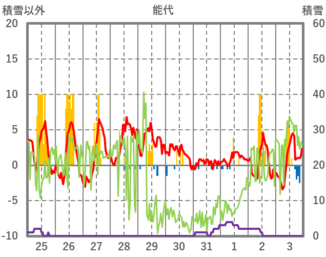 | 日 | 時 | 気温 | 降水 | 風向/風速 | 日照 | 積雪 | 降雪 |
