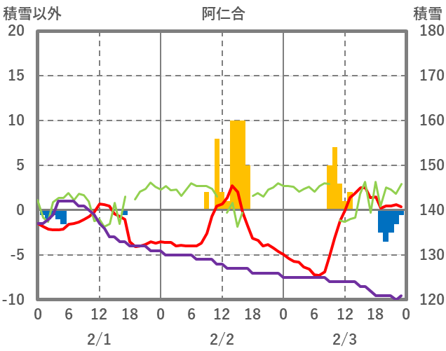 | 日 | 時 | 気温 | 降水 | 風向/風速 | 日照 | 積雪 | 降雪 |