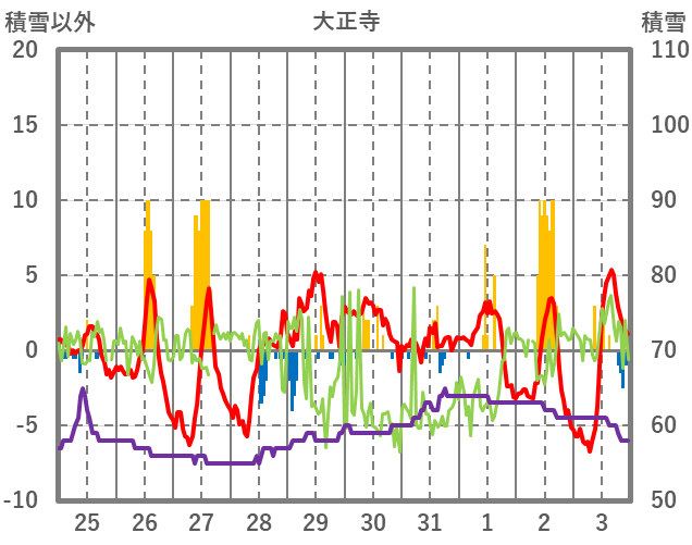 | 日 | 時 | 気温 | 降水 | 風向/風速 | 日照 | 積雪 | 降雪 |