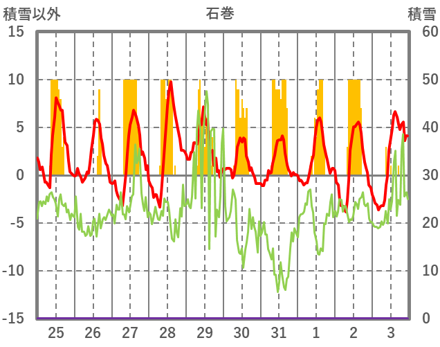 | 日 | 時 | 気温 | 降水 | 風向/風速 | 日照 | 積雪 | 降雪 |