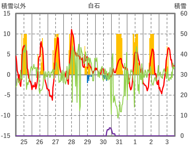 | 日 | 時 | 気温 | 降水 | 風向/風速 | 日照 | 積雪 | 降雪 |
