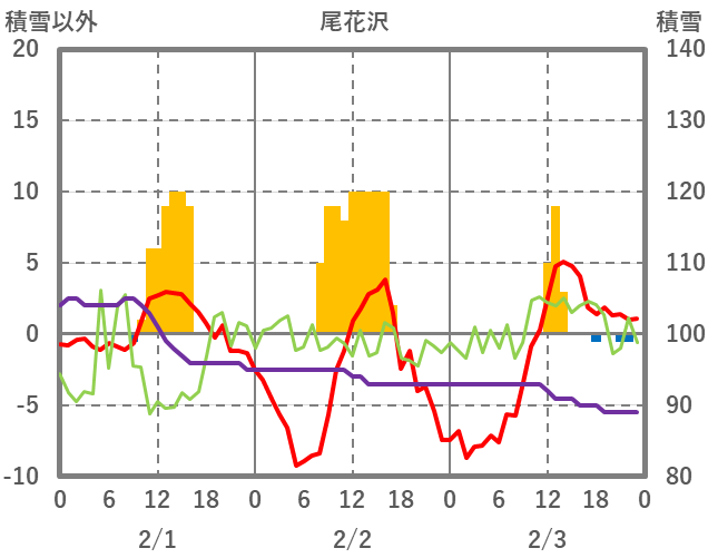 | 日 | 時 | 気温 | 降水 | 風向/風速 | 日照 | 積雪 | 降雪 |