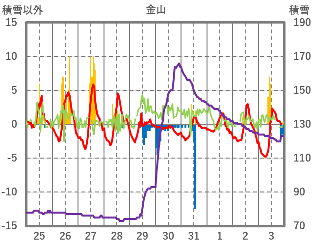 | 日 | 時 | 気温 | 降水 | 風向/風速 | 日照 | 積雪 | 降雪 |