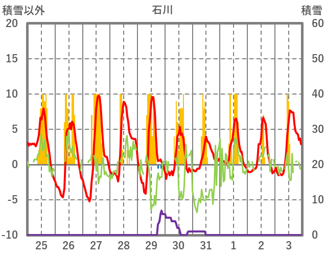 | 日 | 時 | 気温 | 降水 | 風向/風速 | 日照 | 積雪 | 降雪 |