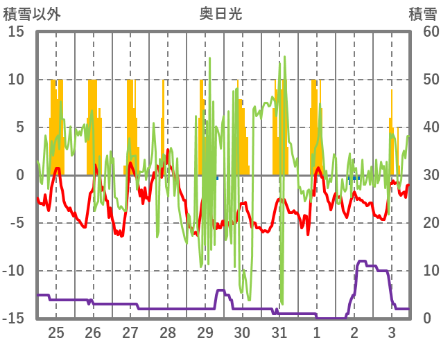 | 日 | 時 | 気温 | 降水 | 風向/風速 | 日照 | 積雪 | 降雪 |