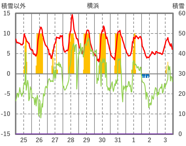 | 日 | 時 | 気温 | 降水 | 風向/風速 | 日照 | 積雪 | 降雪 |