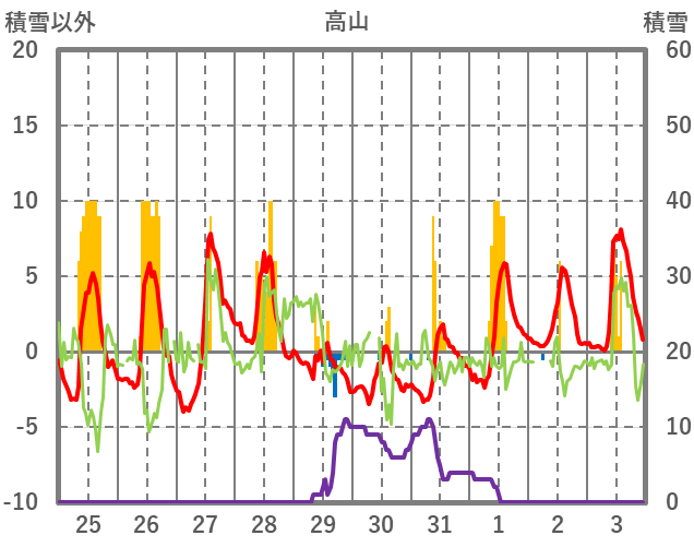 | 日 | 時 | 気温 | 降水 | 風向/風速 | 日照 | 積雪 | 降雪 |