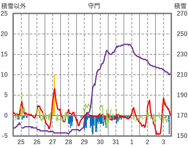 | 日 | 時 | 気温 | 降水 | 風向/風速 | 日照 | 積雪 | 降雪 |