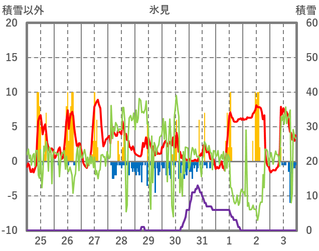 | 日 | 時 | 気温 | 降水 | 風向/風速 | 日照 | 積雪 | 降雪 |
