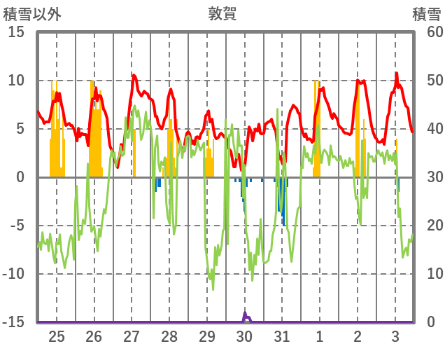 | 日 | 時 | 気温 | 降水 | 風向/風速 | 日照 | 積雪 | 降雪 |