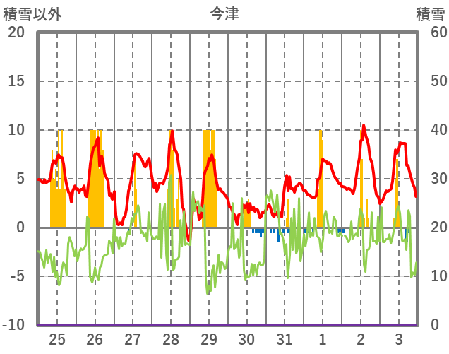 | 日 | 時 | 気温 | 降水 | 風向/風速 | 日照 | 積雪 | 降雪 |