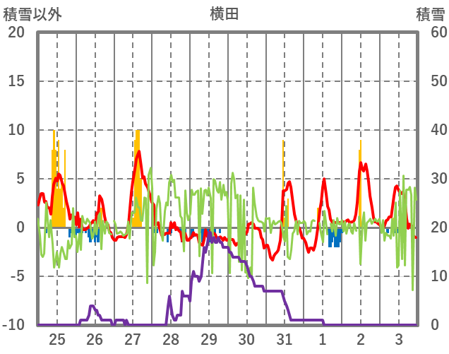 | 日 | 時 | 気温 | 降水 | 風向/風速 | 日照 | 積雪 | 降雪 |