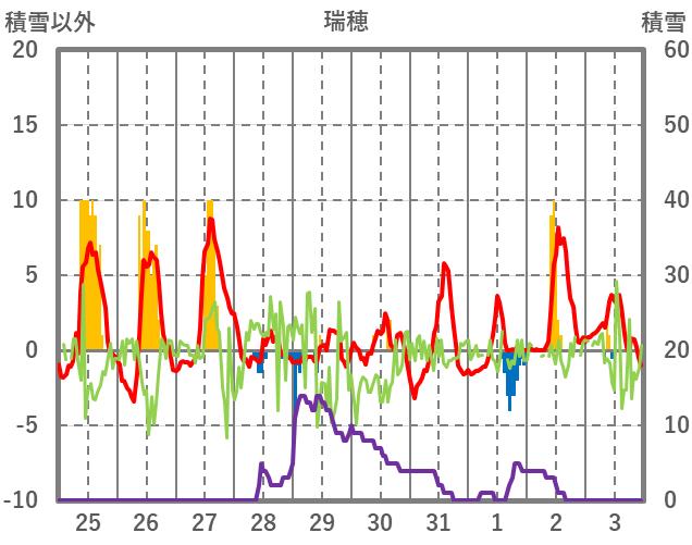 | 日 | 時 | 気温 | 降水 | 風向/風速 | 日照 | 積雪 | 降雪 |