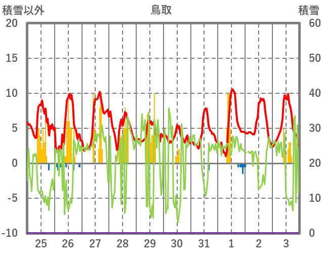 | 日 | 時 | 気温 | 降水 | 風向/風速 | 日照 | 積雪 | 降雪 |