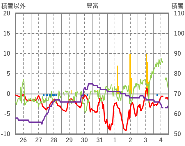 | 日 | 時 | 気温 | 降水 | 風向/風速 | 日照 | 積雪 | 降雪 |