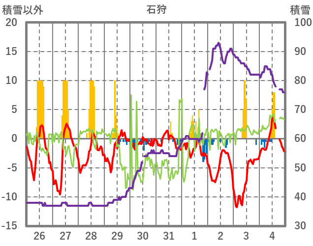 | 日 | 時 | 気温 | 降水 | 風向/風速 | 日照 | 積雪 | 降雪 |