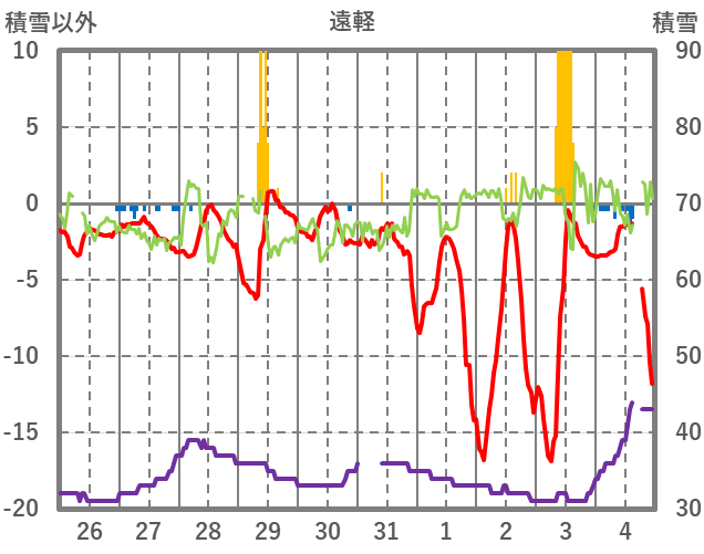 | 日 | 時 | 気温 | 降水 | 風向/風速 | 日照 | 積雪 | 降雪 |