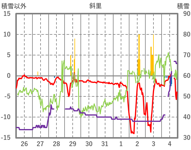 | 日 | 時 | 気温 | 降水 | 風向/風速 | 日照 | 積雪 | 降雪 |