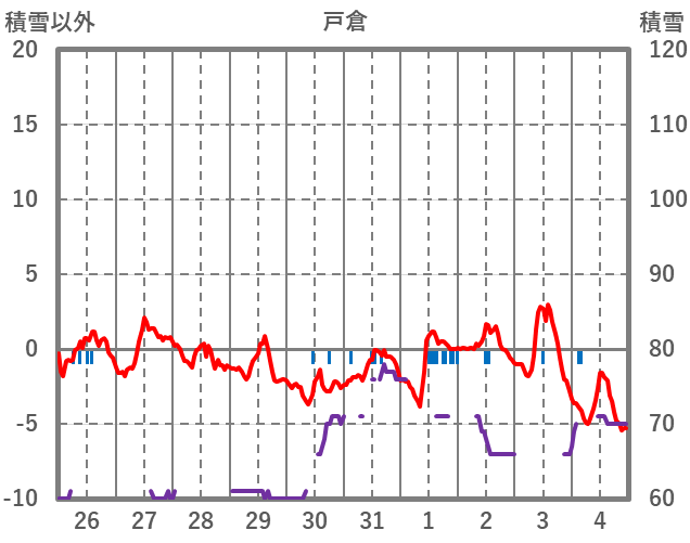 | 日 | 時 | 気温 | 降水 | 風向/風速 | 日照 | 積雪 | 降雪 |