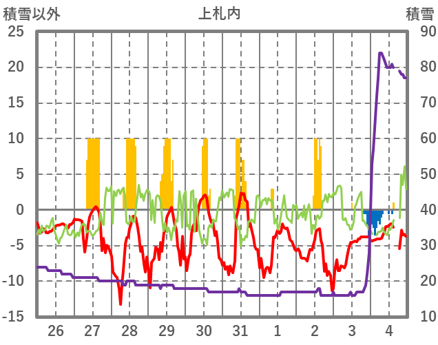 | 日 | 時 | 気温 | 降水 | 風向/風速 | 日照 | 積雪 | 降雪 |