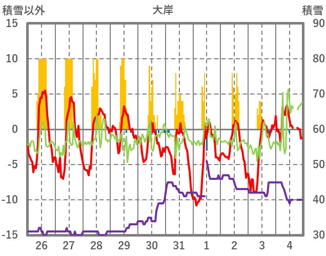 | 日 | 時 | 気温 | 降水 | 風向/風速 | 日照 | 積雪 | 降雪 |