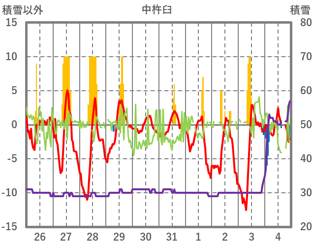 | 日 | 時 | 気温 | 降水 | 風向/風速 | 日照 | 積雪 | 降雪 |