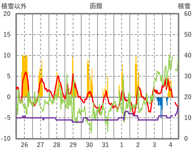 | 日 | 時 | 気温 | 降水 | 風向/風速 | 日照 | 積雪 | 降雪 |