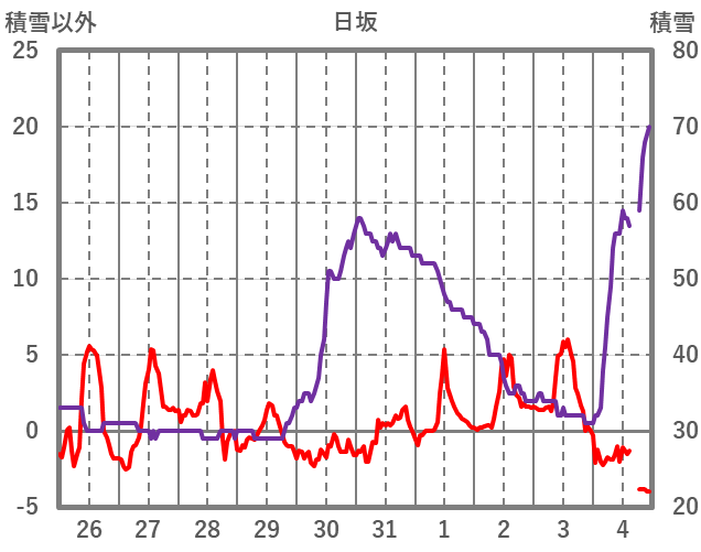 | 日 | 時 | 気温 | 降水 | 風向/風速 | 日照 | 積雪 | 降雪 |