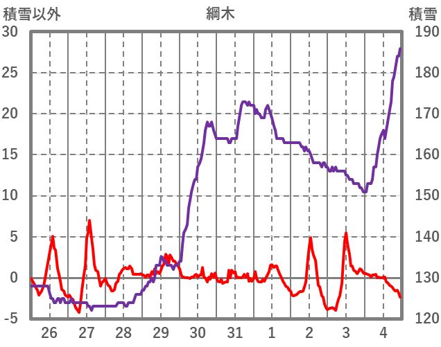 | 日 | 時 | 気温 | 降水 | 風向/風速 | 日照 | 積雪 | 降雪 |