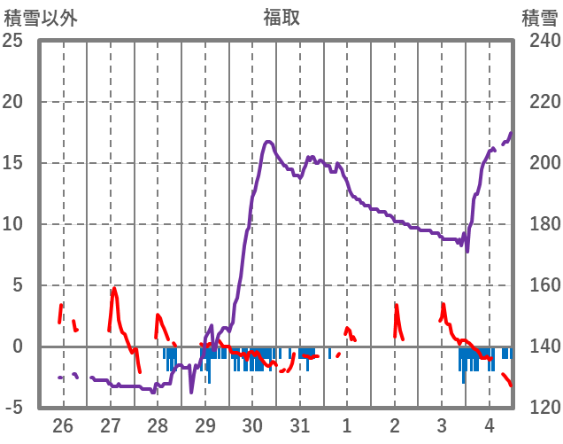 | 日 | 時 | 気温 | 降水 | 風向/風速 | 日照 | 積雪 | 降雪 |