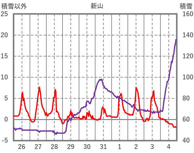 | 日 | 時 | 気温 | 降水 | 風向/風速 | 日照 | 積雪 | 降雪 |
