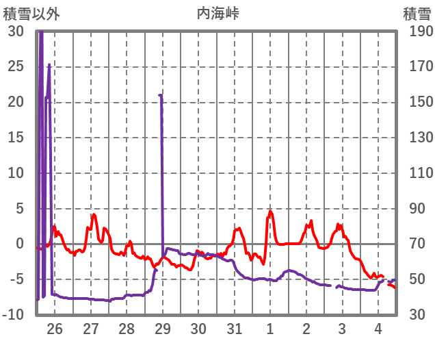 | 日 | 時 | 気温 | 降水 | 風向/風速 | 日照 | 積雪 | 降雪 |