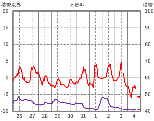 | 日 | 時 | 気温 | 降水 | 風向/風速 | 日照 | 積雪 | 降雪 |