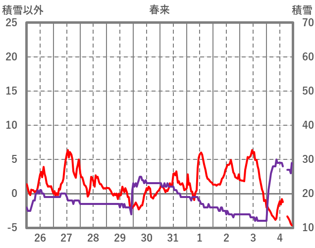 | 日 | 時 | 気温 | 降水 | 風向/風速 | 日照 | 積雪 | 降雪 |