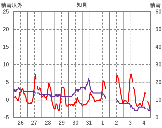 | 日 | 時 | 気温 | 降水 | 風向/風速 | 日照 | 積雪 | 降雪 |