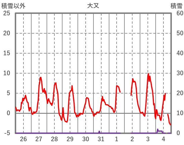 | 日 | 時 | 気温 | 降水 | 風向/風速 | 日照 | 積雪 | 降雪 |