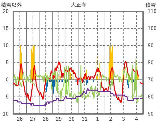 | 日 | 時 | 気温 | 降水 | 風向/風速 | 日照 | 積雪 | 降雪 |